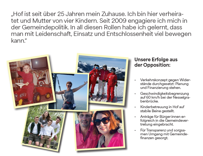 ich kandidiere als eure Bürgermeisterin, weil mir Hof am Herzen liegt und ich bereit bin, Verantwortung zu übernehmen. Für unsere Gemeinde. Für unsere Kinder. Für unsere Zukunft.